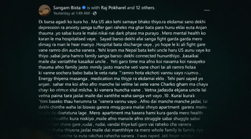 उनले सामाजिक सञ्जालमा लेख्दै आफू लामो समयदेखि डिप्रेसन र एन्जाइटी जस्ता मानसिक समस्यासँग जुधिरहेको अवस्थामा आफूले ‘दाइ’ जस्तै मानेको व्यक्तिबाट यस्तो घटना भएको उल्लेख गरेकी छन्। परिवारमा असर पर्ने डरका कारण तत्काल कुरा बाहिर ल्याउन नसकेको पनि उनले बताएकी छन्।