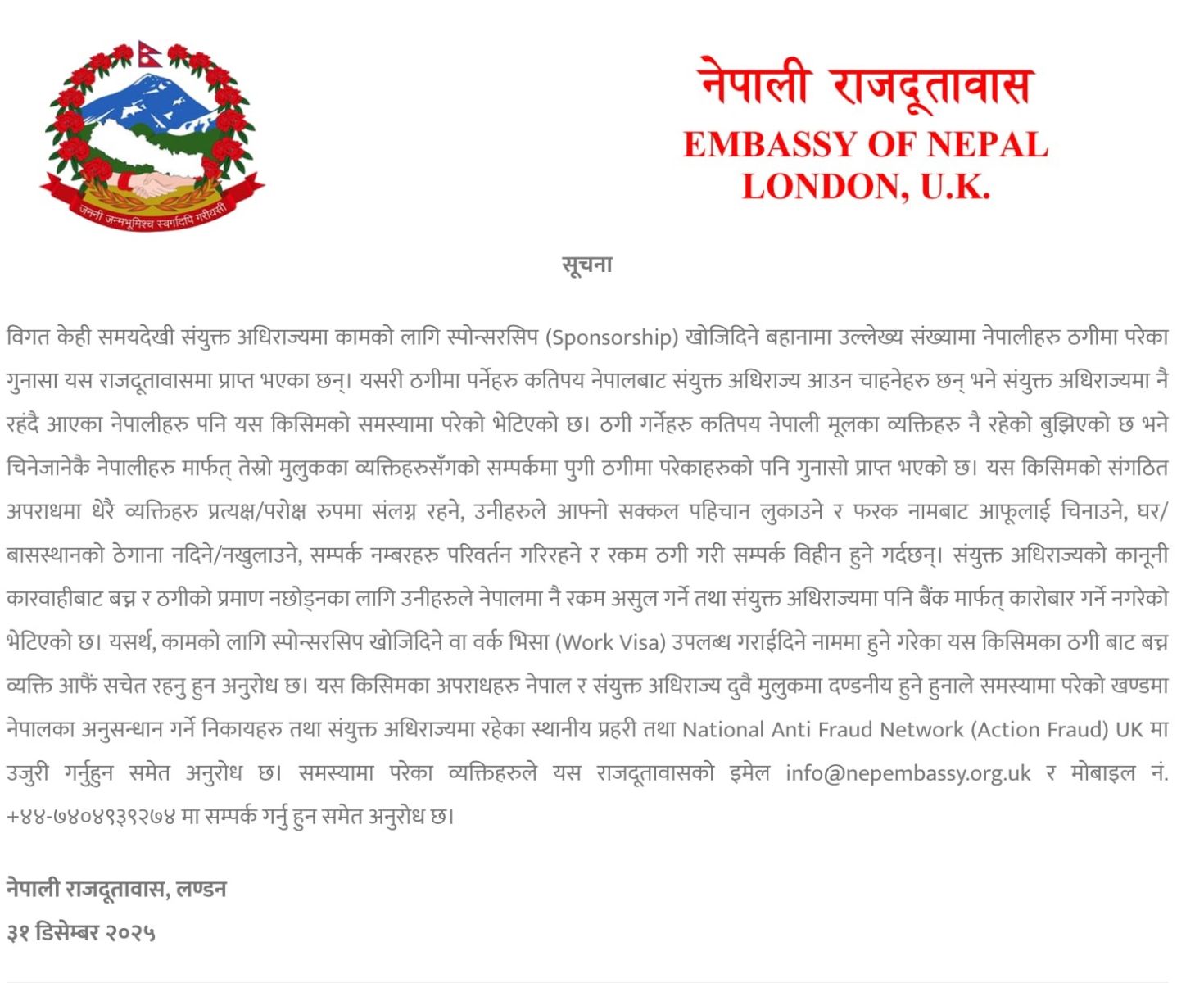 ठगीमा परेका वा थप जानकारी चाहिने व्यक्तिले मोबाइल नम्बर +४४–७४०४९३९२७४ मा सम्पर्क गर्न सक्ने दूतावासले जनाएको छ ।