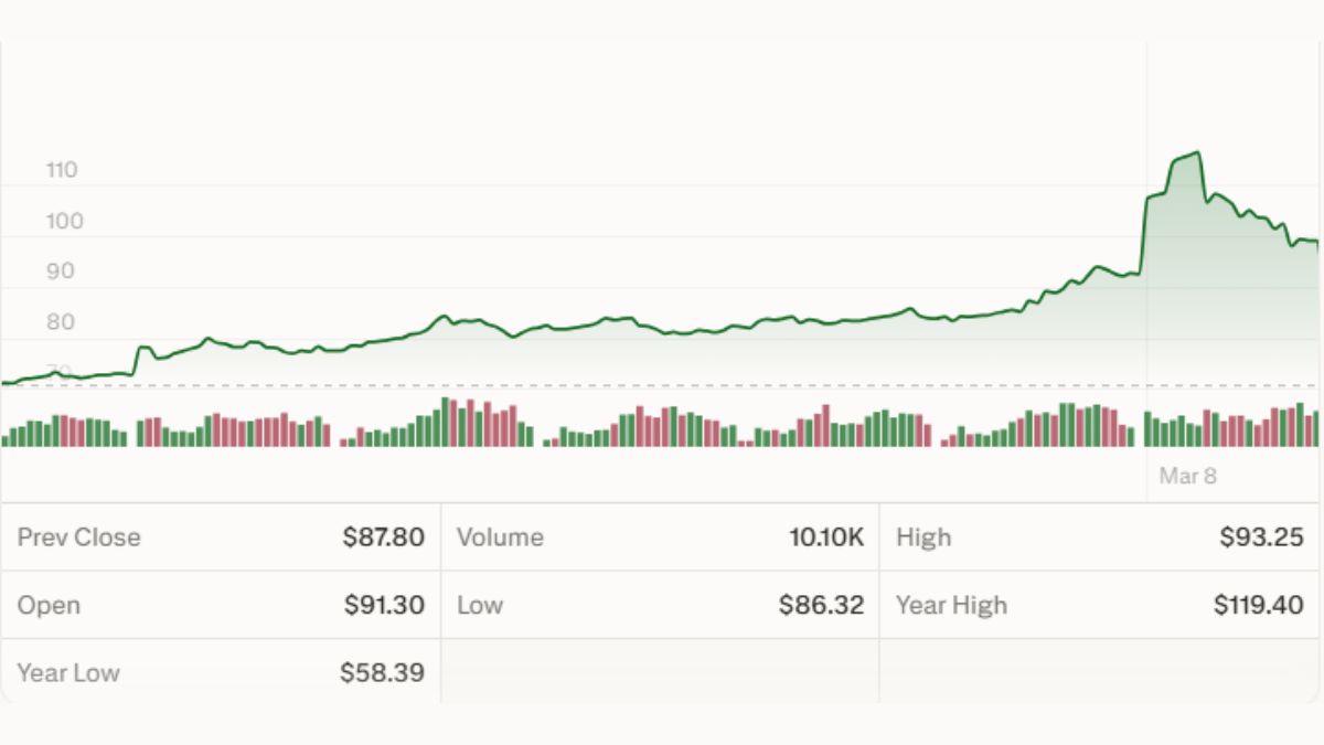 फेब्रुअरी २७ (युद्धअघि) देखि मार्च १० सम्मको मूल्यको उतार–चढाव (डाटा स्रोत: पर्प्लेक्सिटी फाइनान्स)।