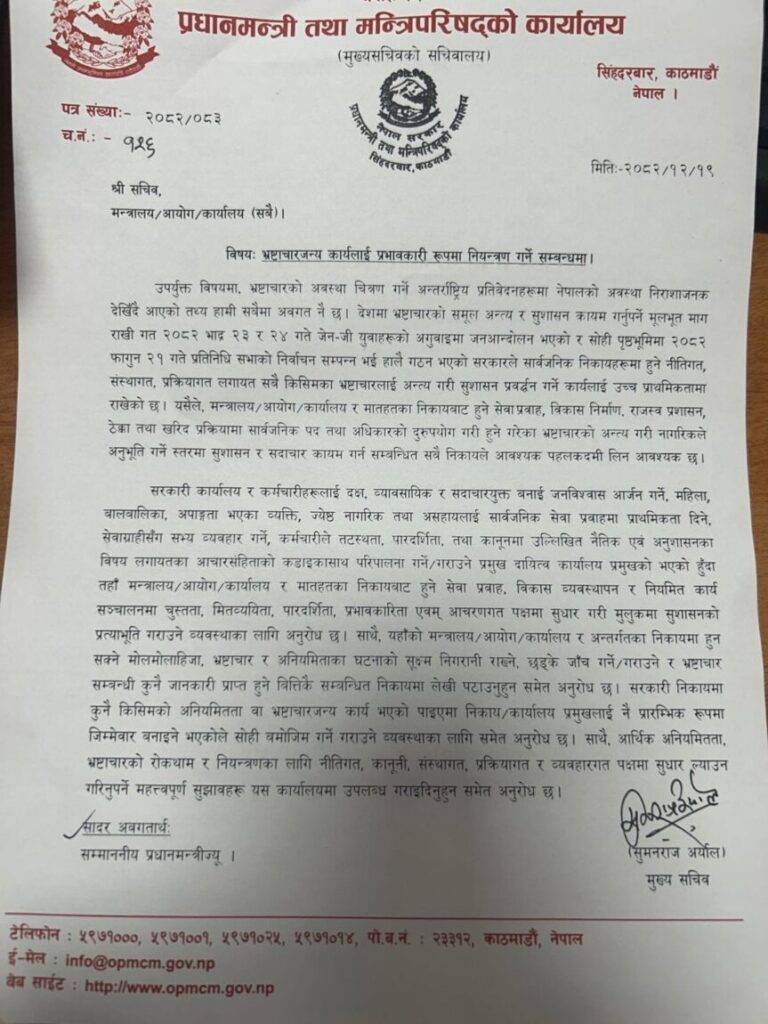 प्रधानमन्त्री बालेन शाह नेतृत्वको सरकारको कर्मचारीतन्त्रले  मुलुकमा सुशासन र भ्रष्टाचार नियन्त्रणलाई उच्च प्राथमिकतामा राख्दै प्रशासनिक निकायहरूलाई कडा निर्देशन दिएको छ। मुख्य सचिव सुमनराज अर्यालले मन्त्रालय, आयोग र सरकारी कार्यालयहरूलाई परिपत्र जारी गर्दै सरकारी सेवा, विकास निर्माण, राजस्व प्रशासन, ठेक्का र खरिद प्रक्रियामा हुने भ्रष्टाचार र अनियमिततालाई प्रभावकारी रूपमा नियन्त्रण गर्न निर्देशन दिएका हुन्।