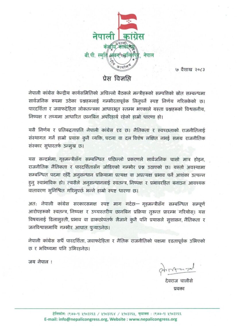 कांग्रेसले सरकारसमक्ष गृहमन्त्रीसँग सम्बन्धित सबै आरोपमाथि तत्काल स्वतन्त्र, निष्पक्ष र उच्चस्तरीय छानबिन प्रक्रिया सुरु गर्न माग गरेको छ।