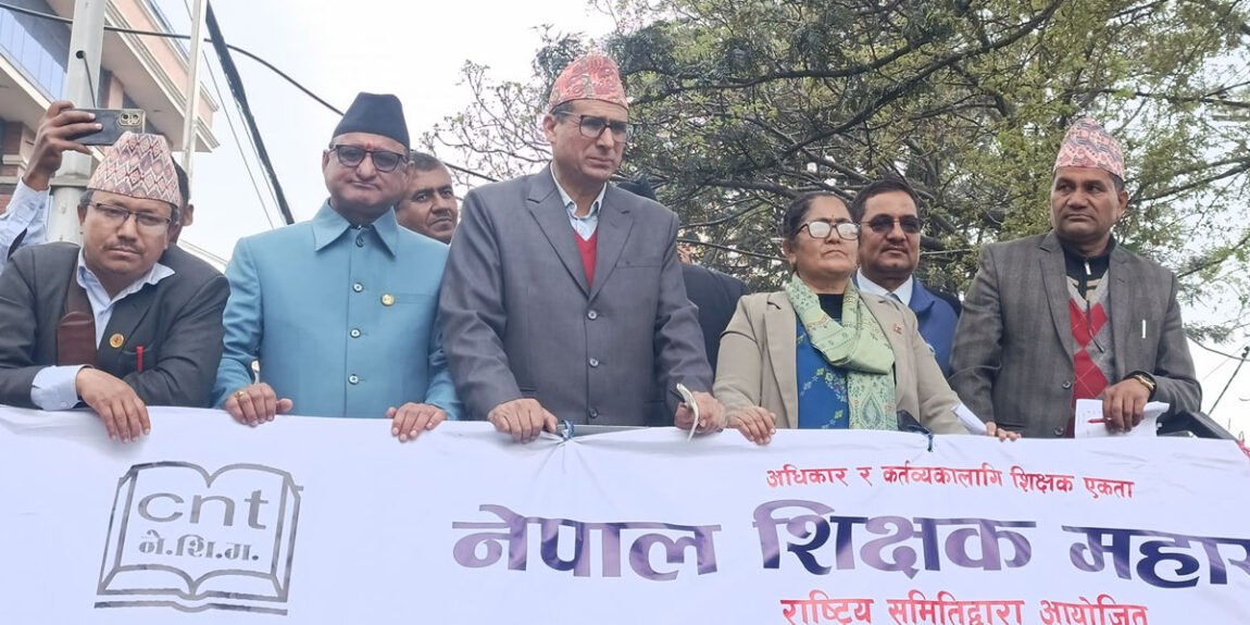विद्यालय शिक्षा विधेयकविरुद्ध शिक्षक महासंघको एमाले कार्यालयमा धर्ना